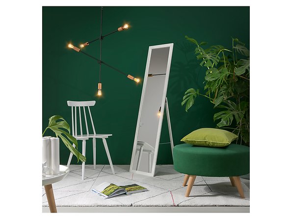 Lustro stojące  białe – wąskie, wysokie lustro sprawdzi się w przedpokoju, garderobie czy pokoju nastolatki. Zaletą lustra stojącego jest  możliwość dowolnego przestawiania. Stabilne podparcie zapewnia stelaż wzmocniony podpórkami.  Dzięki uniwersalnej, prostej ramie o neutralnej kolorystyce lustro może stać się częścią wielu  aranżacji.