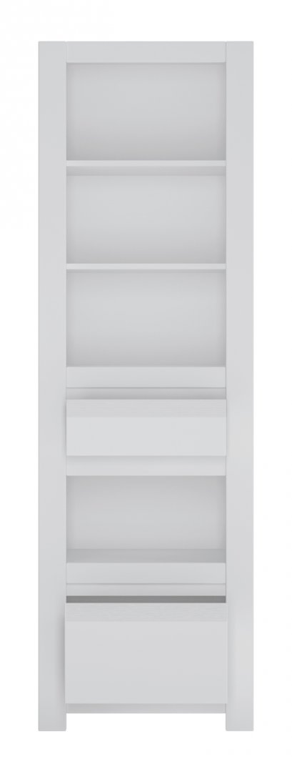 Regał 2S TYP NVIR01. W regale został zastosowany wygodny system bezuchwytowy. Korpus wykonany jest z płyty wiórowej laminowanej odpornej na uszkodzenia, zarysowania, działanie wilgoci i wysokiej temperatury. Kolekcja Novi to proste, elegancke meble, dzięki którym zaaranżujesz jadalnię, pokój dzienny oraz pokój młodzieżowy. Charakterystyczną cechą dla kolekcji są ryflowane listwy na gładkich frontach oraz brak uchwytów, które zostały zastąpione systemem bezuchwytowym. W szufladach zastosowano prowadnice z pełnym wysuwem, a w stole prowadnice synchroniczne.