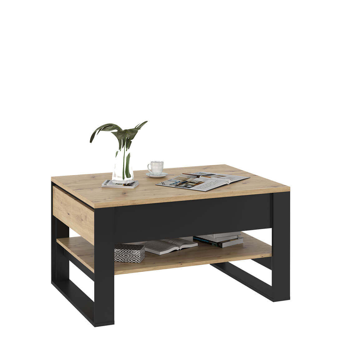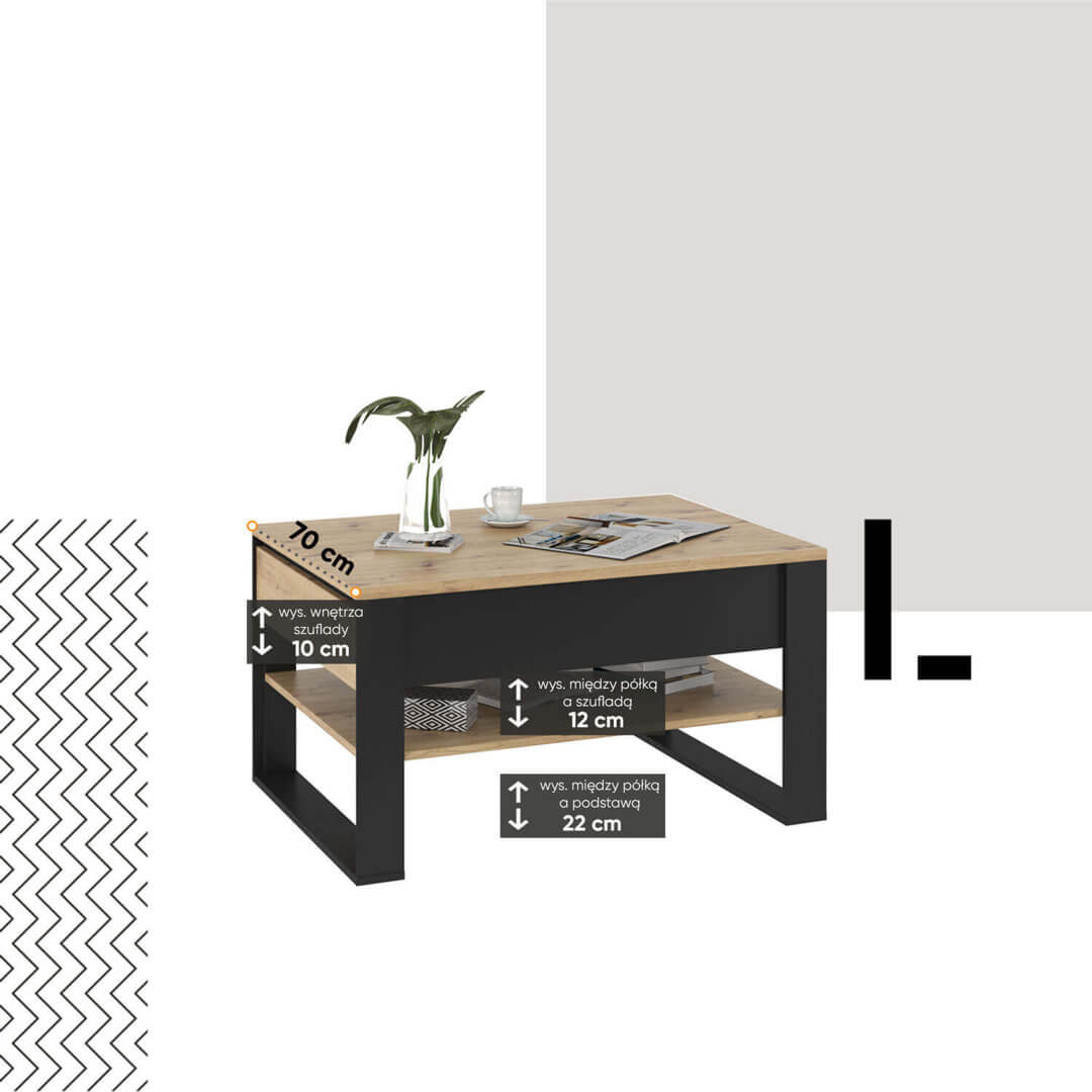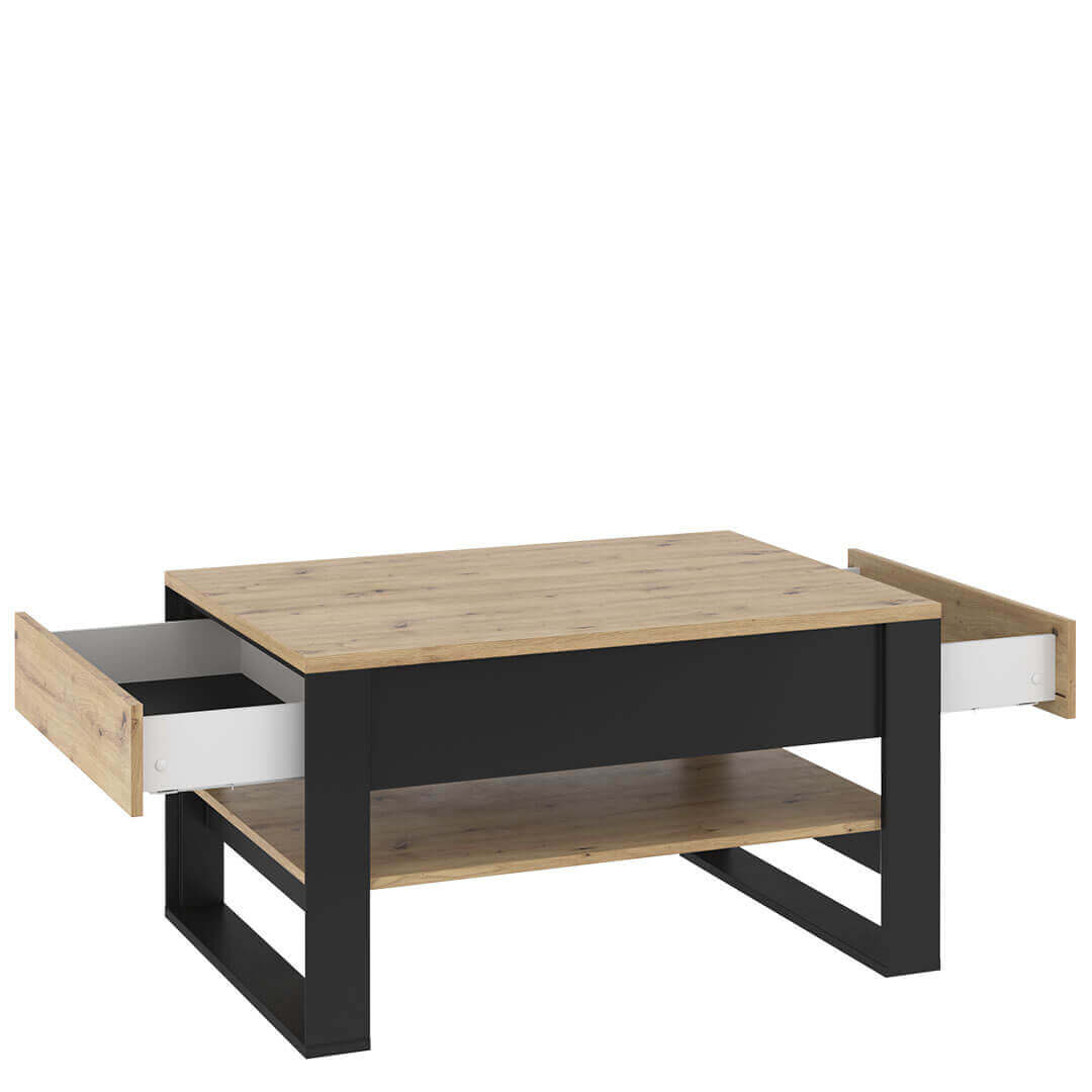 Stolik kawowy z dwiema szufladami i półką.  QUANT to nowoczesne, eleganckie meble, które łączą ciekawy, loftowy styl z wysoką funkcjonalnością. Stylowy charakter kolekcji podkreślają czarne, geometryczne podpory oraz fronty w ciekawym dekorze 3D. W kolekcji QUANT  zostały zastosowane dwa rodzaje oświetlenia -  wewnętrzne w przeszklonych witrynach oraz zewnętrzne, podkreślające przestrzenność frontów.  Z kolekcją QUANT łatwo zaaranżujesz elegancki salon w duchu przytulnej nowoczesności.